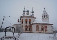 Казанская церковь была построена в 1694 году на средства Строганова, богатейшего русского купца. Таких «строгановских» церквей в России пять, две находятся в Нижнем Новгороде, одна – в Сольвычегодске, одна – в Усолье, и одна – в Устюжне. Белокаменный узор вокруг окон – верный признак того, что вы наткнулись на строгановскую церковь.